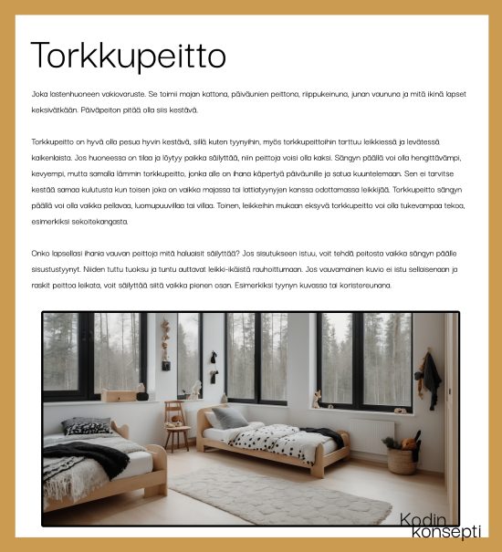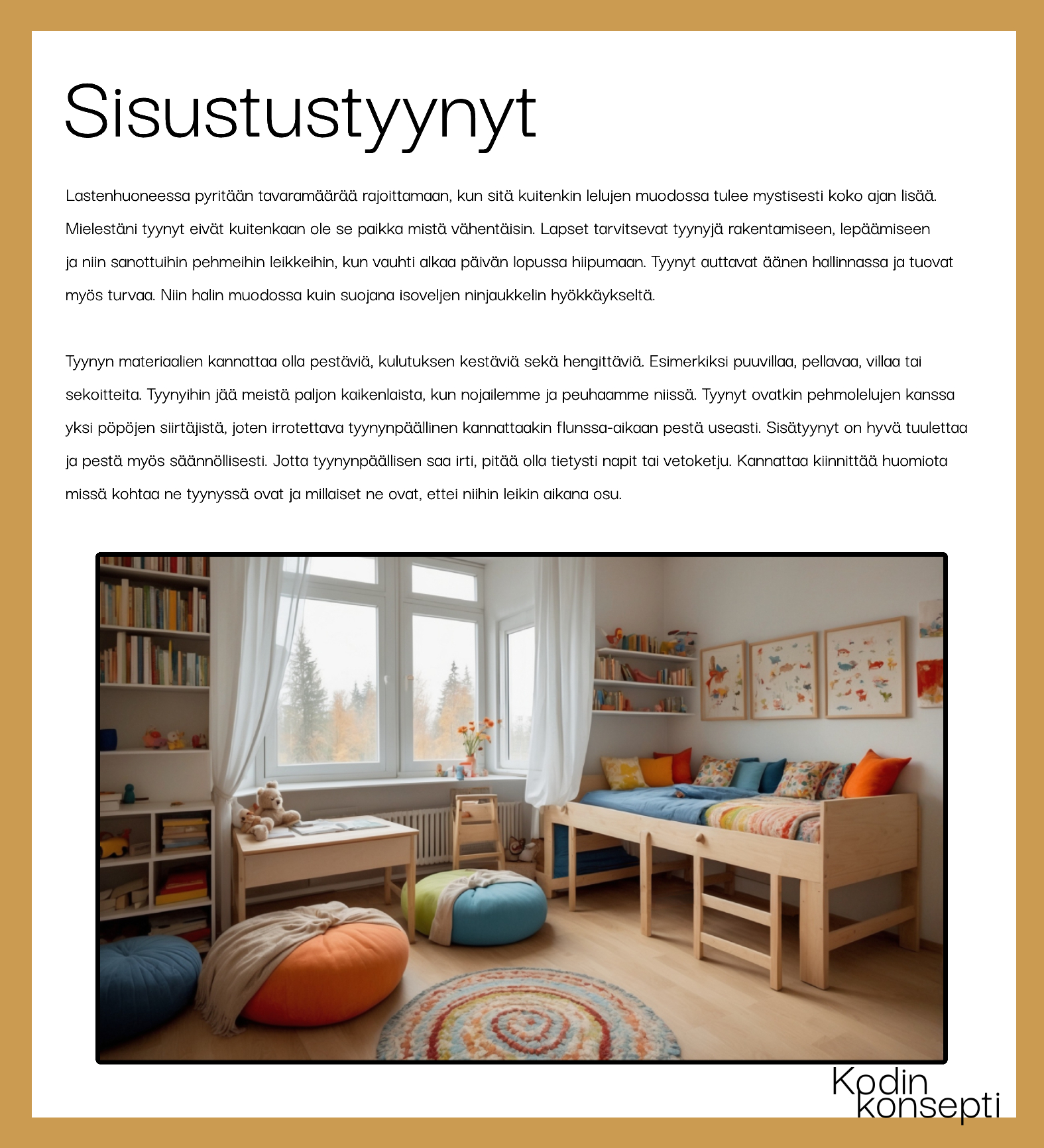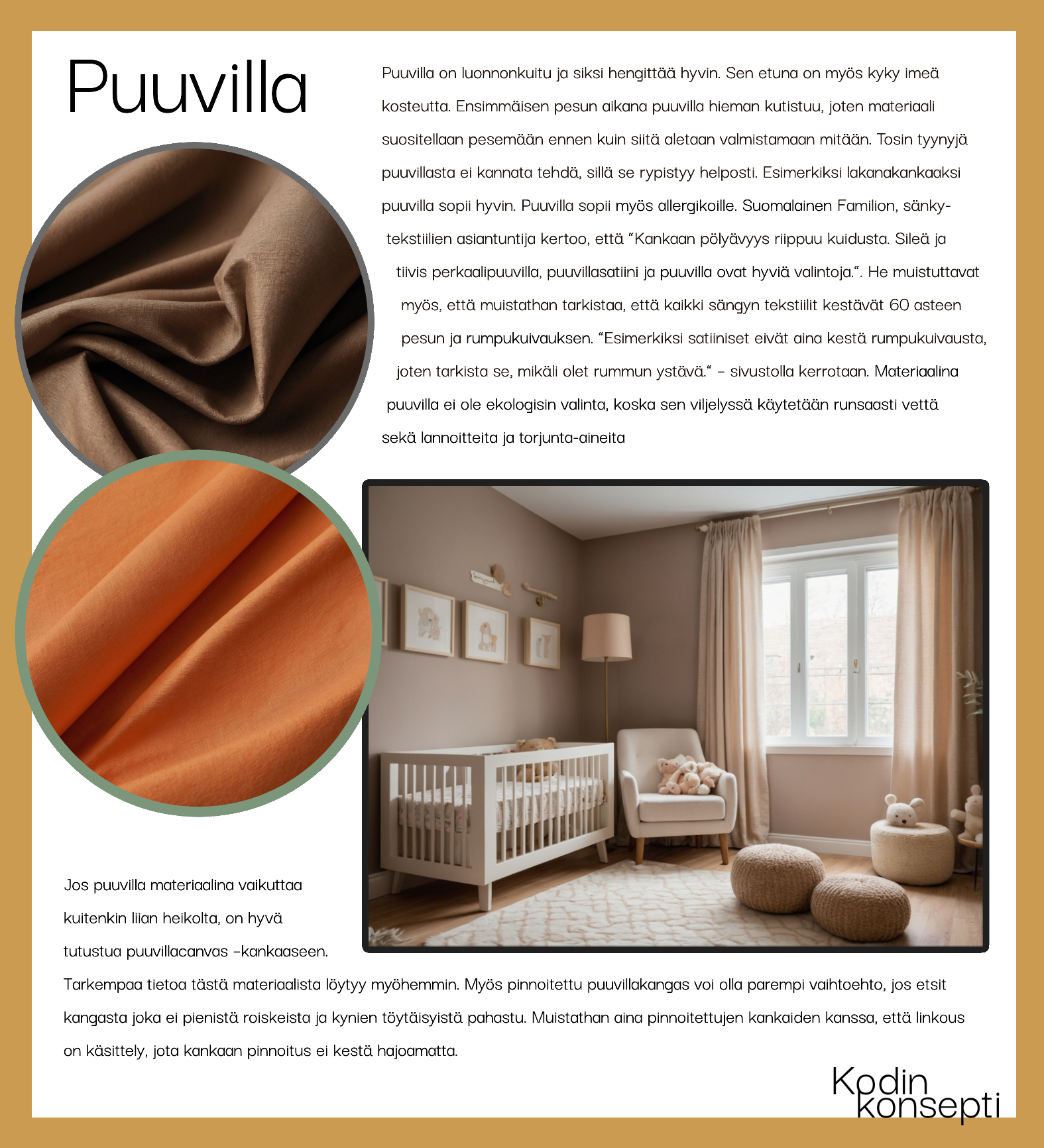 Sisustussuunnittelijan ohjeet avuksesi, kun valitset tekstiilejä lastenhuoneeseen. Mikä kangas kannattaa valita esimerkiksi verhoihin, tyynyihin, mattoon tai säkkituoliin? Tämän oppaan avulla opit erilaisista kankaista ja niiden käyttömahdollisuuksista. Tämän jälkeen sinun on helpompi tehdä päätös minkälaisia materiaaleja lastenhuoneeseen voi valita. Mukana myös paljon inspiroivia kuvia.
